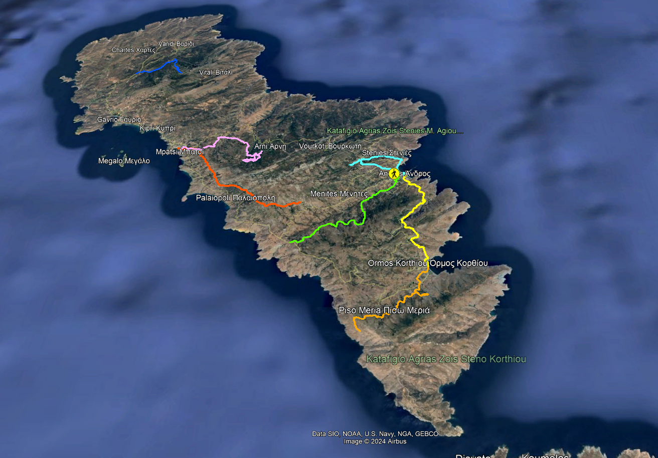 - Route: Andros Town Dipotamata Valley to Korthi Bay