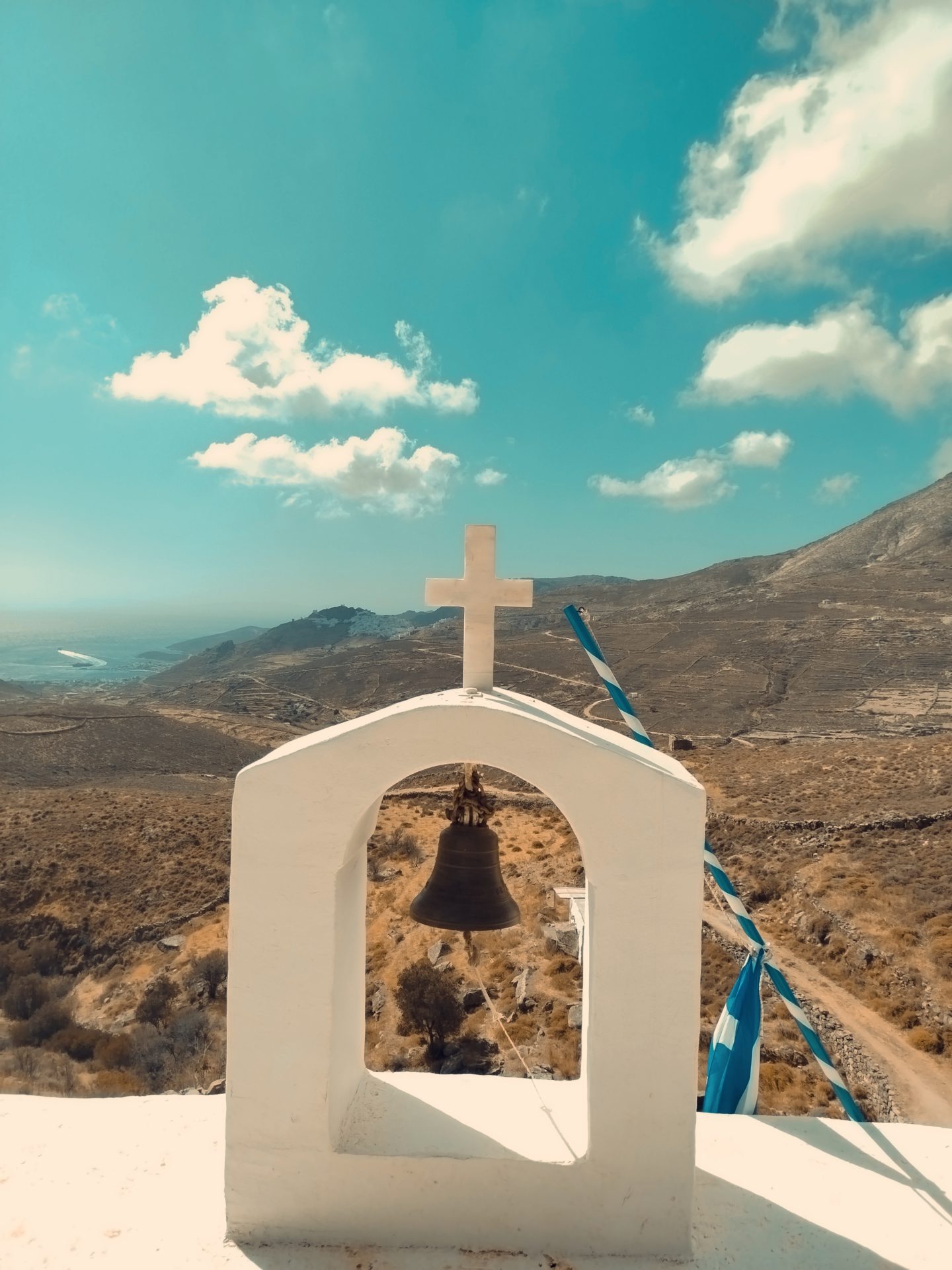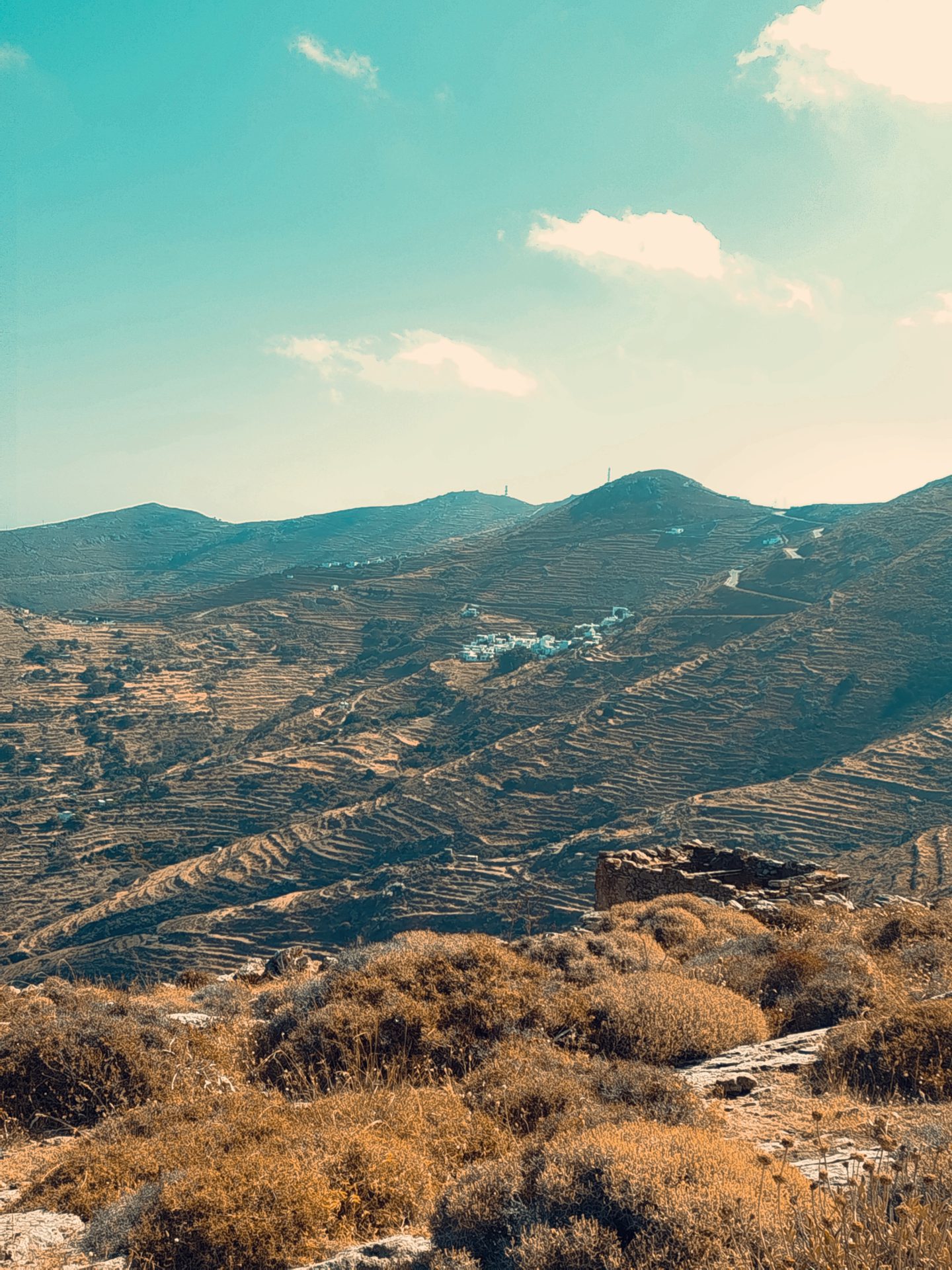 Serifos is a more rugged and dramatic island, shaped by strong light, open horizons and a long mining history. Its landscape is marked by old mining paths, abandoned installations and terraced hillsides that descend towards the sea, creating a powerful contrast between industry and nature.