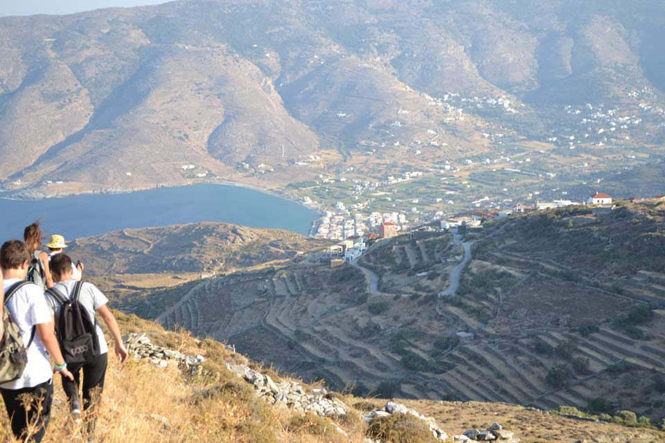 Today’s hike is little bit challenging. Our route starts at the outset of Marlas, passing striking terraces that remind us of a gigantic theatre. It continues to Mamados, ringing the unique landscape and passing through the abandoned village of Ismail. From there the old trail ends up in Mali. The trail going down to Mali is impressive due to its unending view towards Andros. A refreshing swim in the clear blue waters of Mali will reward you. The return continues uphill, via the trail that goes by the old stonecutters, leading to the settlement of Koumelas. The uphill climb begins passing through demarcated trails, looking upon the mines of green marble, to take us back to Marlas. From there and via an excellent marble trail we descend towards Pyrgos.