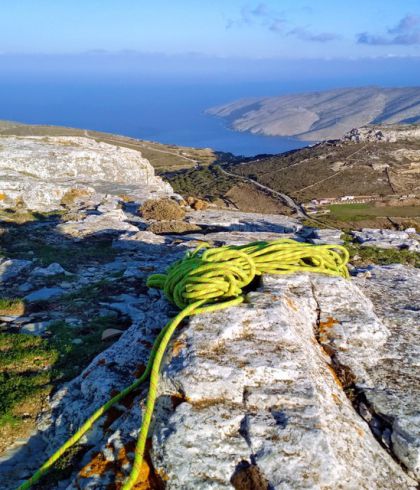 This rock climbing and abseiling adventure day is designed to be fun and friendly! Meet your guide in the morning and get a transfer to your climbing site. Our instructor will get you learning the techniques and skills involved in both climbing and abseiling. There are a variety of routes to choose from so there’s something to suit all abilities. Vouni is situated in the South of Andros with the beautiful limestone cliffs and 7 routes on the climbing area (8-12m). From here, you’ll have a stunning view of the surrounding area and to the sea. Beginner climbers will be safely watched at every step to gain the first tips of the climbing techniques with climbing gear. More experienced climbers will get the chance to improve their level of expertise and create great memories while climbing amongst the cliffs.