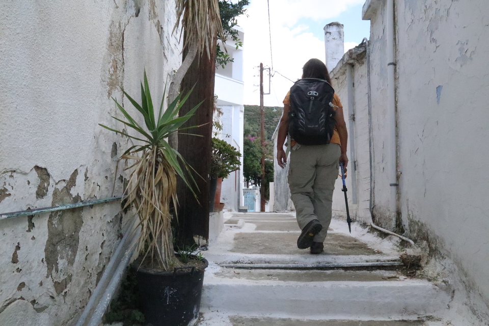 After our break, we begin the return journey on a different trail, descending through the small settlements of Alamania and Agia Marina. These quiet clusters of homes offer more views into local life and unspoiled natural surroundings, as we make our way back to the blue curve of Korthi Bay.