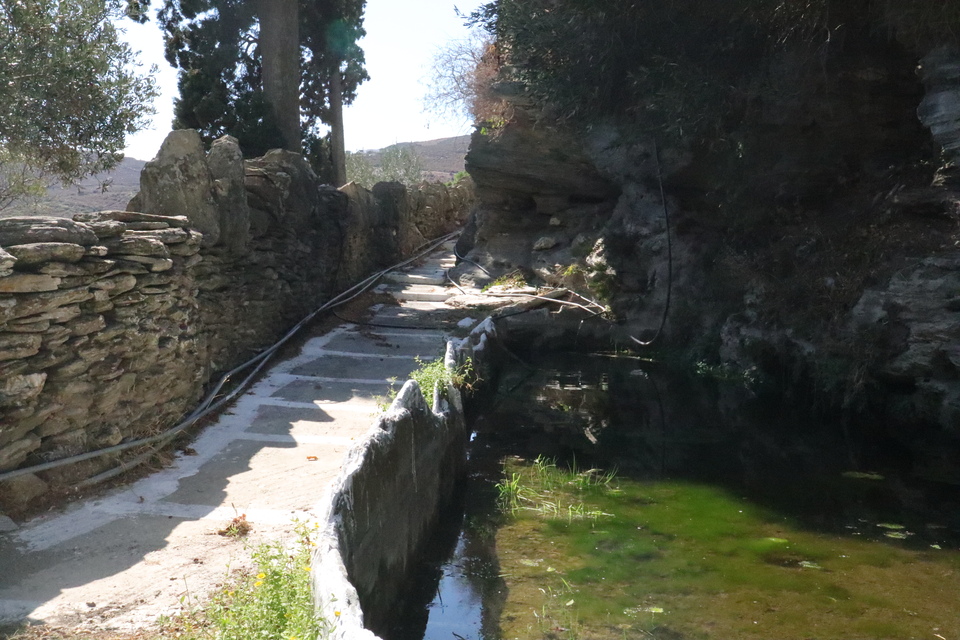 We begin our hike in Korthi Bay, crossing the kampos, a fertile lowland area shaped by riverbeds, stables, and farmland. The landscape is alive with gardens, livestock, and citrus groves, offering a living portrait of Andros’ rural economy.