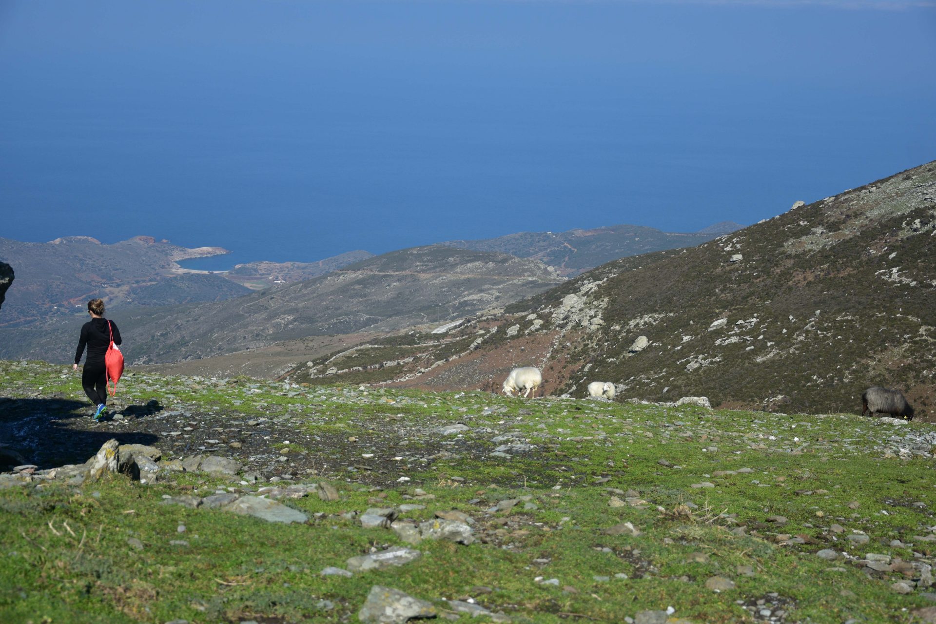 Η συνέχεια θα μας βρει να κατεβαίνουμε το εντυπωσιακό πέτρινο καλντερίμι, μέρος του σηματοδοτουμενου μονοπατιού Andros Routes no3 για να καταλήξουμε στα καταγάλανα νερά της πασίγνωστης παραλίας Γριάς το Πήδημα.